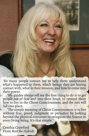 Our friend and guide, Cynthia Crawford, has passed from this life. She was among the first people Barbara and I interviewed for Meet the Hybrids, and I was immediately struck – as most of us are – by her light, her loving energy.