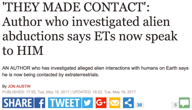 I’m trying and failing to avoid pointing out that I have never once used the phrase ‘alien contactees’. And I also cannot help finding the word ‘alleged’ an odd choice, as I have never used the word ‘aliens’, and have no idea from where or whom the telepathic messages arrive. This is one of the problems with this kind of coverage – it lacks important accuracy and subtlety.